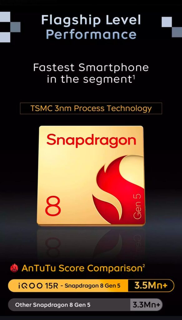 iQOO 15R को खासतौर पर उन यूज़र्स के लिए डिजाइन किया गया है जिन्हें तेज और स्मूद परफॉर्मेंस की जरूरत होती है। इस स्मार्टफोन में लेटेस्ट और पावरफुल Snapdragon प्रोसेसर दिया गया है, जो हाई-स्पीड प्रोसेसिंग और बेहतर पावर एफिशिएंसी प्रदान करता है। इसके कारण फोन में ऐप्स बहुत तेजी से ओपन होते हैं और मल्टीटास्किंग के दौरान भी किसी तरह का लैग महसूस नहीं होता।